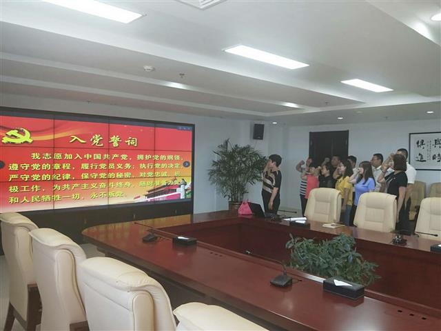 2018年6月26日,党政办公室党支部组织全体党员以集体宣誓的方式开展重温入党誓词活动。在鲜红的党旗下,全体党员佩戴党徽,举起右拳,庄严宣誓。七一前夕,通过组织党员开展入党宣誓和重温入党誓词行动,让党员重温入党时的庄严承诺和坚定决心,在党旗下接受心灵的净化和洗礼,牢记共产党员的政治责任和历史使命,不断保持共产党员的先进性,以更加饱满的热情投身各自岗位工作,切实发挥共产党员的先锋模范作用,永葆共产党员的政治本色,以实际行动向建党97周年献礼。