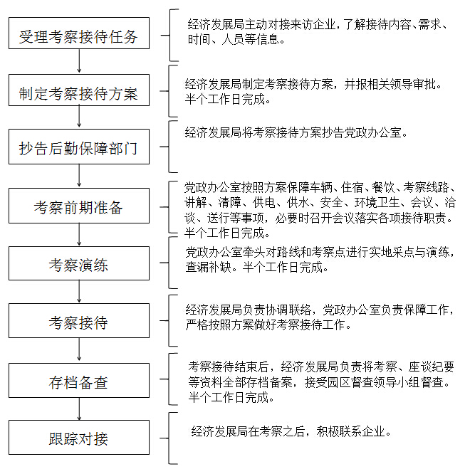 经济发展局制定考察接待方案并组织实施,党政办按照方案保障现场考察、会议组织、住宿餐饮、车辆调派等后勤服务。